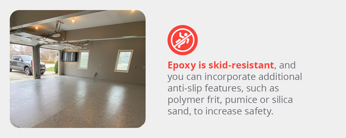 Whether you live with kids, elderly loved ones or pets, epoxy can be a beneficial choice for your home. It delivers that rich, glossy look without increasing the chance of a slip or fall. With that said, be sure to keep the ground dry and clean of slick substances like grease and oil to create a safe surface.